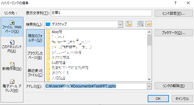 ここでコピーしたパスを1つ目の図のハイパーリンクの編集のアドレスにペーストするだけです。