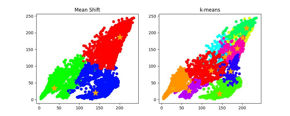 ax[0].scatter(df["red"], df["blue"], c=cm.hsv(ms.labels_/len(ms.cluster_centers_)))